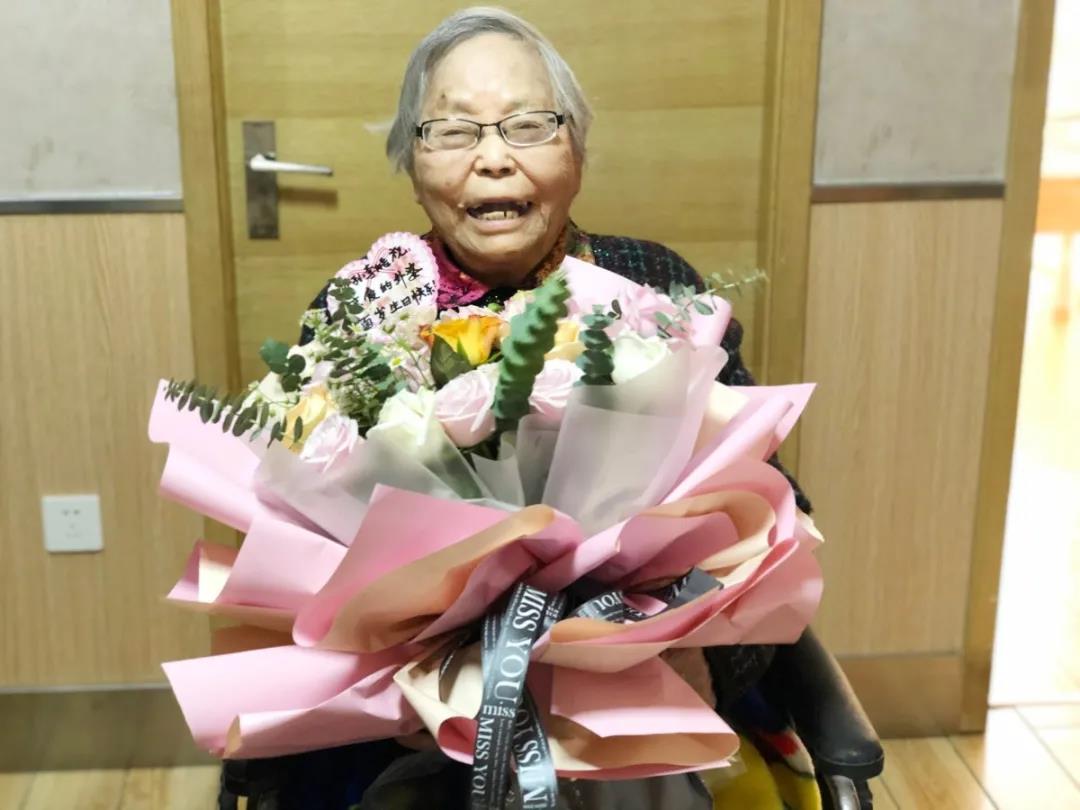 如今期颐之年的她依旧精神矍铄,充满师者的睿慈。近,无锡梅园护理院给老人准备了一份惊喜,为蒋老师集结了40多名学生共同庆祝她的100岁大寿,朗高祝愿蒋老师福如东海,寿比南山,在这特殊的日子里感受桃李满天下的喜悦。生日会开始之前,护理员阿姨为蒋嘉英老师扎上一条喜气的丝巾。“住在朗高四年了,不管是医护人员还是院领导,对我的照护都是特别认真细心的,就像是我的亲儿女,真正让我的生活变得便利又开心。特地叫学生们陪我一起过生日,令我感到格外幸福,非常感谢朗高的付出。”蒋老师高兴地说。