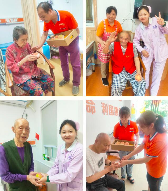在收到这些爱心水蜜桃后,机构员工便将部分桃子分发至无锡梅园护理院长者、员工、环卫工人……将这份关心与爱护传递给朗高大家庭的每个份子,用最甜蜜的方式,让大家感受到盛夏里最暖心的陪伴与慰问。