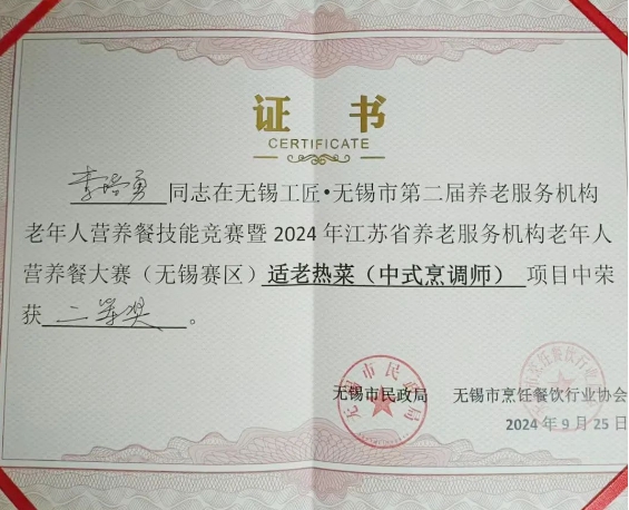 在中华文化的悠久传统中,有句流传千古的谚语:“民以食为天”,而在现代养老服务领域,如何让长者吃得放心、开心,则成了一项既考验专业技能又需倾注人文关怀的重大课题。近日,无锡市滨湖区蠡园朗高养老院李培勇厨师凭借卓越的烹饪技艺与对老年人膳食健康的深刻理解,在无锡工匠▪无锡市第二届养老服务机构老年人营养餐技能竞赛暨 2024年江苏省养老服务机构老年人营养餐大赛(无锡赛区)适老热菜项目中荣获二等奖!